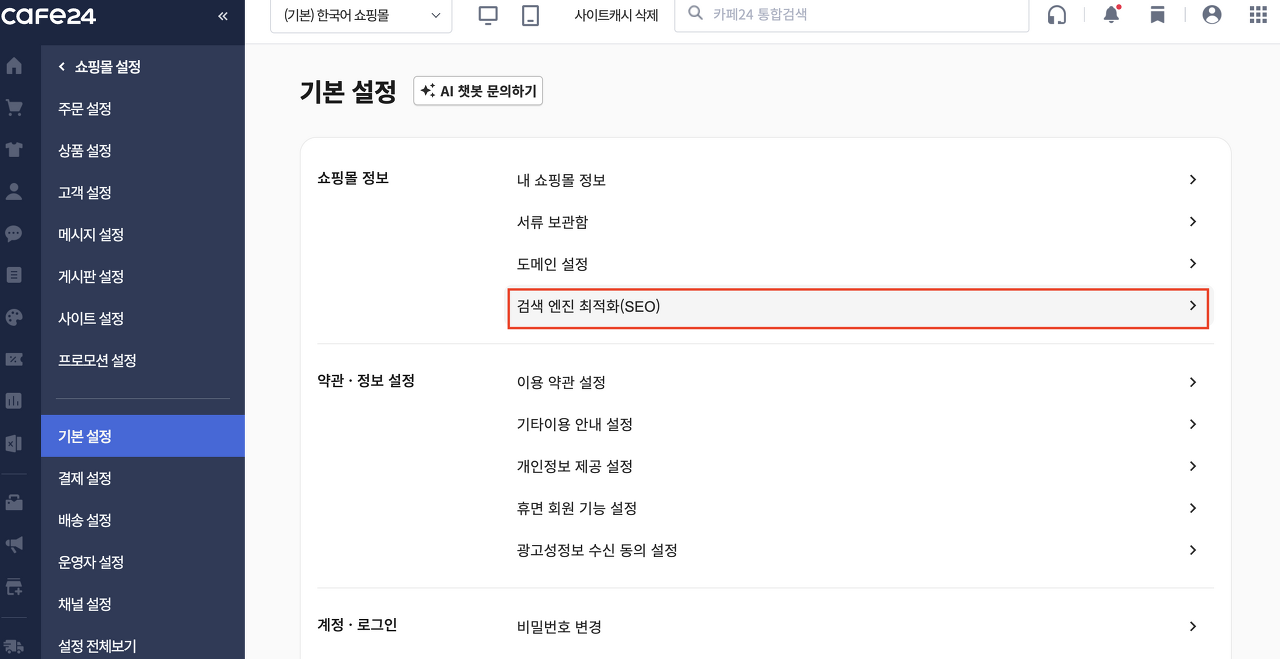 (1) 카페24: 쇼핑몰 설정 > 기본설정 > 검색 엔진 최적화 > 고급 설정 > 코드 직접입력