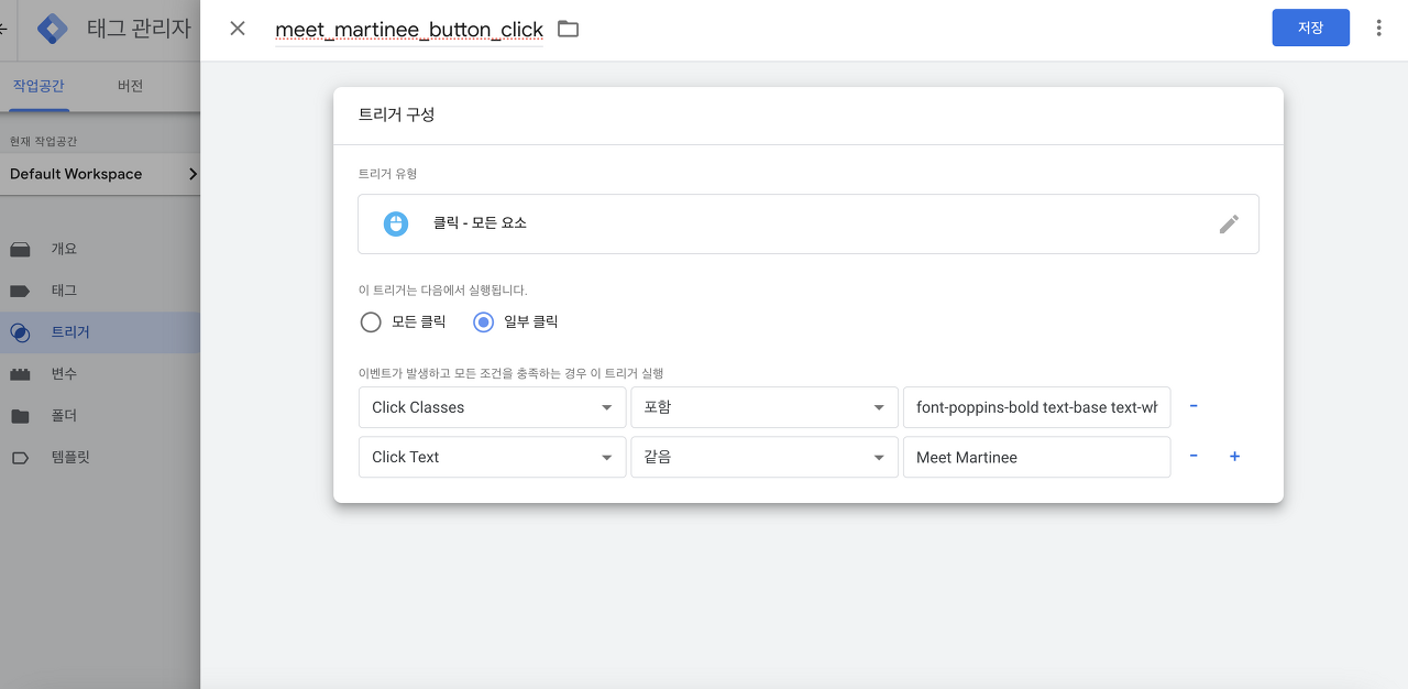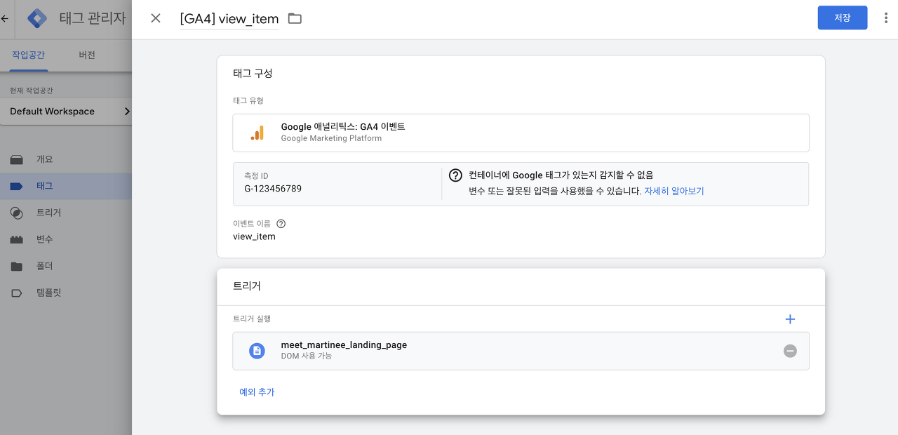 이벤트 이름과 내가 설정한 meet_martinee_landing_page 트리거를 설정한 후 '저장'을 클릭하면 Meet Martinee 페이지에 랜딩 할 때마다 GA4의 view_item 이벤트가 발동하게 되는 것이다.