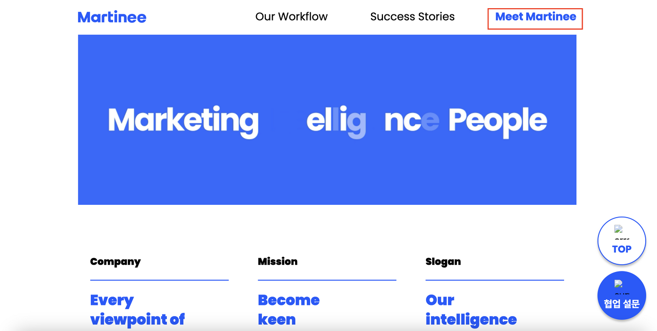 마티니아이오 페이지를 예시로 들어보자. 마티니 아이오 홈페이지에 들어가면 상단 바에 'Our Workflow', 'Success Stories', 'Meet Martinee' 탭이 보인다.