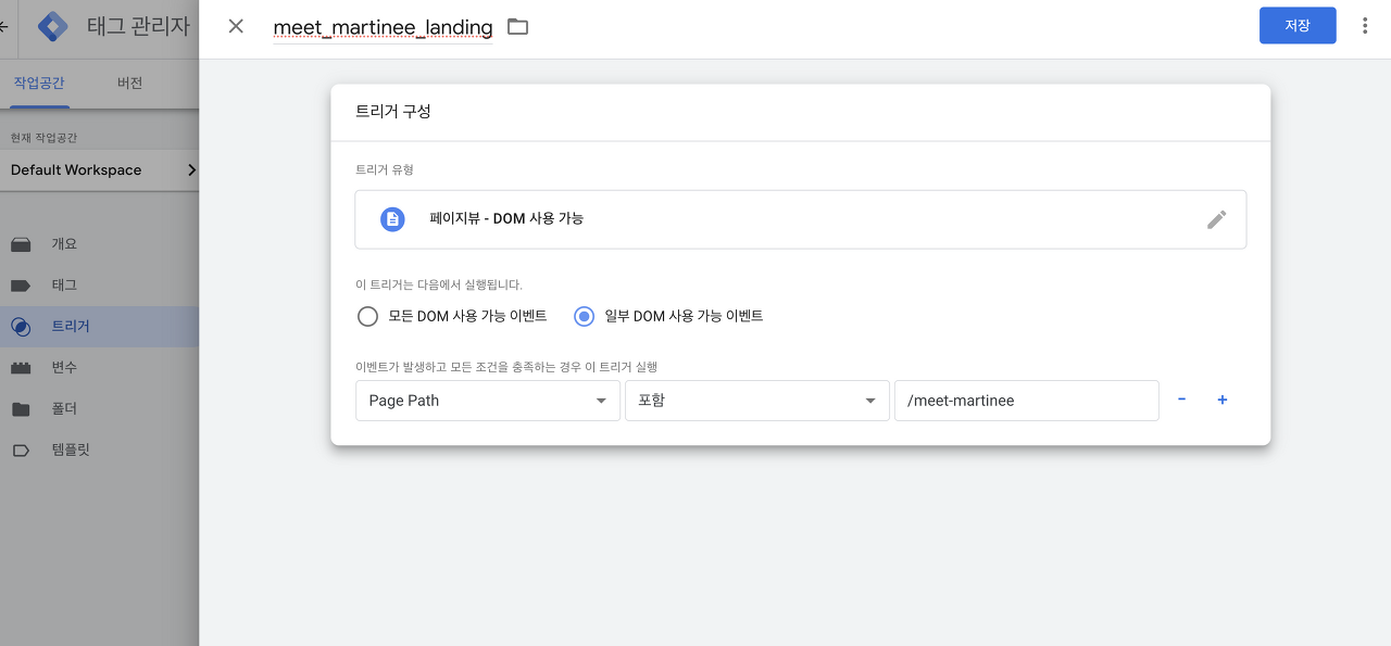 트리거 유형은 'DOM 사용 가능'으로, 특정 페이지 URL이 랜딩 됐을 때만 이벤트가 발동해야 하므로 '일부 DOM 사용 가능 이벤트'로 설정한 후 page path 조건을 걸어둔다.