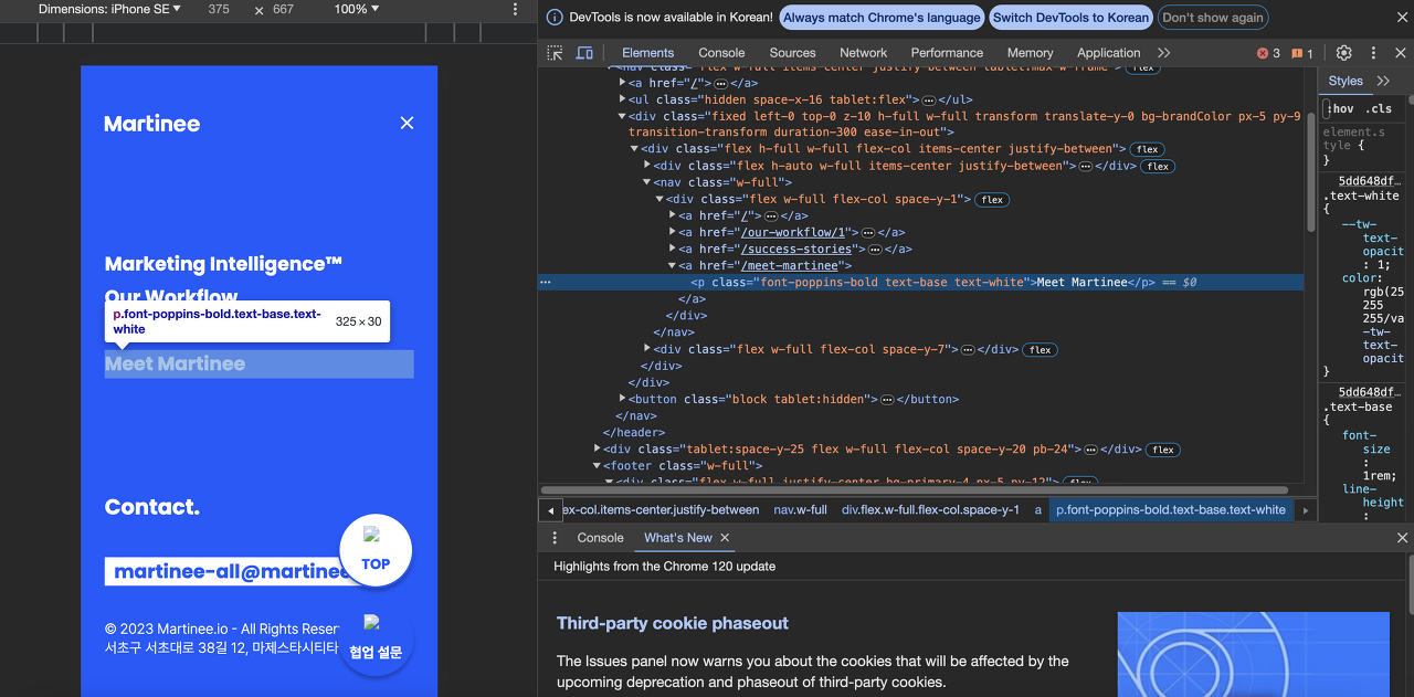 개발자 도구에서 보면 해당 버튼의 클래스 이름은 "font-poppins-bold text-base text-white"이고 버튼 텍스트는 "Meet Martinee"임을 알 수 있다.