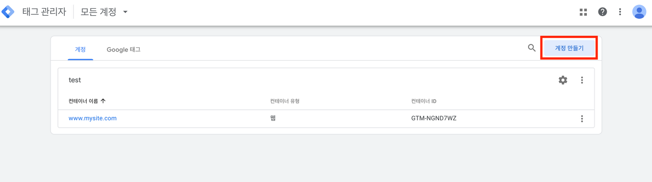 우선 GTM 사이트(링크)에 들어가서 GTM의 계정과 컨테이너를 생성한다.