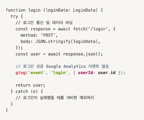 위 코드 스니펫은 유저가 로그인 성공했을 때 gtag(구글태그)라고 하는 해당 코드를 발동시켜 user_id를 포함한 login 이벤트를 구글 매체에게 전송하는 역할을 가지고 있다.